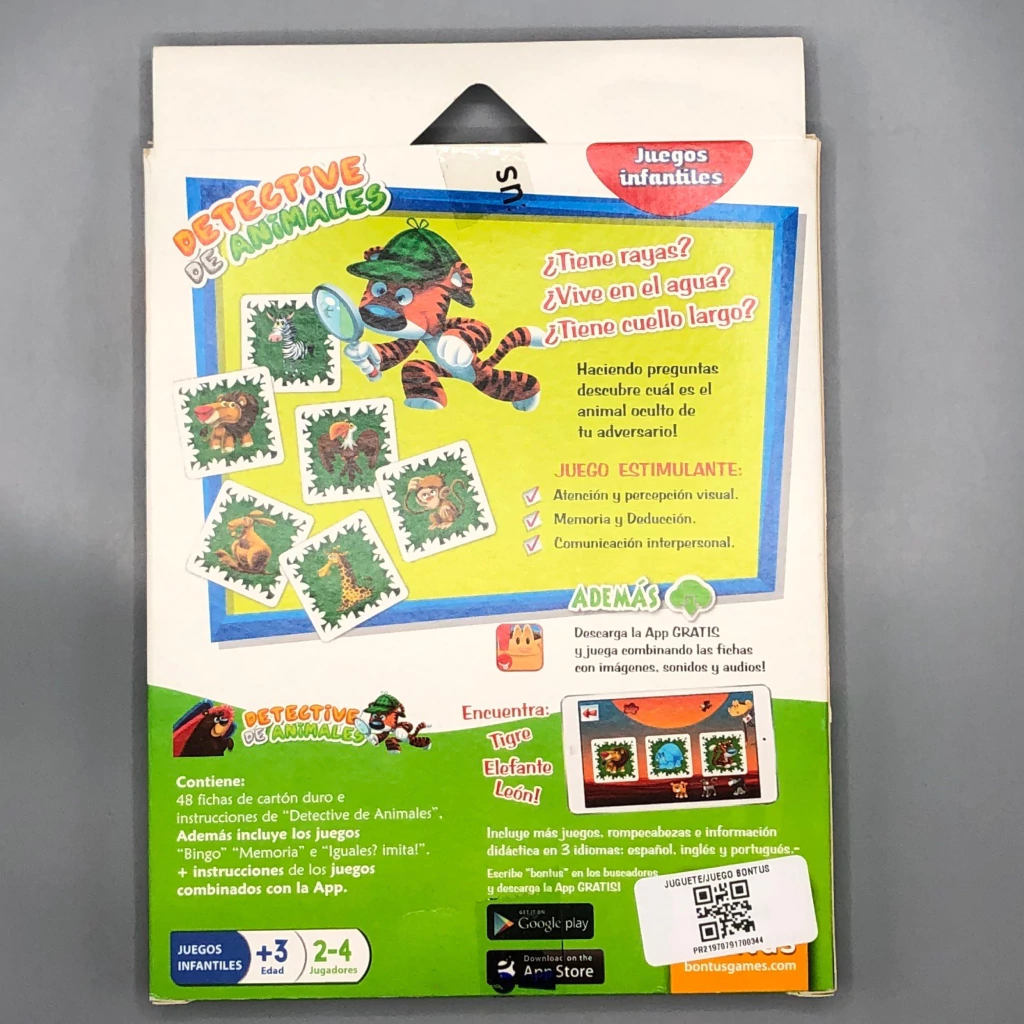 El Detective de Animales es un juego infantil diseñado para desarrollar habilidades cognitivas y sociales en niños a partir de los 3 años. Este juego educativo promueve la atención, la percepción visual, la memoria, la deducción y la comunicación interpersonal.